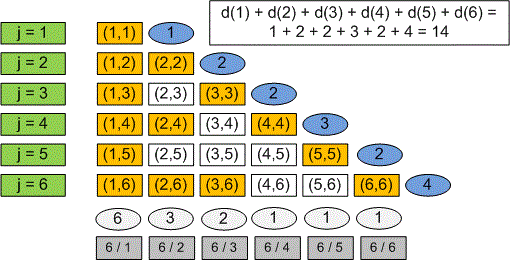 The number of such for which is equal to the number of divisors of . Since , we need to find the count of all divisors of numbers from to . In other words, we need to find the sum . However, calculating requires factoring the number , so direct computation of this sum takes time.