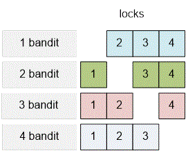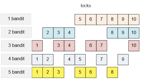 They decided to install several locks on the door in such a way that it opens only when all the locks are opened. Each lock may have up to keys, distributed among some subset of the bandits. A group of bandits can open a lock if and only if at least one member of the group possesses a key to that lock.