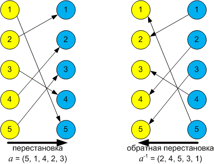 Генеруємо випадкову перестановку без фіксованих точок. Нехай, наприклад, . Обчислимо перестановку, їй обернену: .